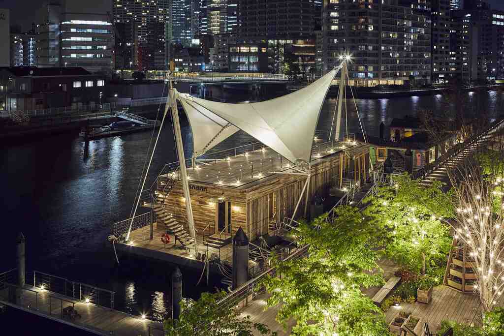 In November 2020, the floating art hotel PETALS TOKYO was launched in Tennoz, Tokyo. The complex consists of four multicolored hotel boats anchored beside the vessel T-LOTUS M, a dedicated event space designed under the supervision of architect Kengo Kuma. Like the houseboats in Amsterdam, which was developed as a city of canals, each of the four boats has been meticulously handcrafted with its own individual design concept. The interiors are all unique and boast a premium feel. Located at a junction between the river and the sea, this canal connects Tokyo, one of the largest cities in Asia, to the world beyond the sea. A small distance from the hustle and bustle of the metropolis, there is no place like this where visitors can feel the natural waterfront atmosphere.