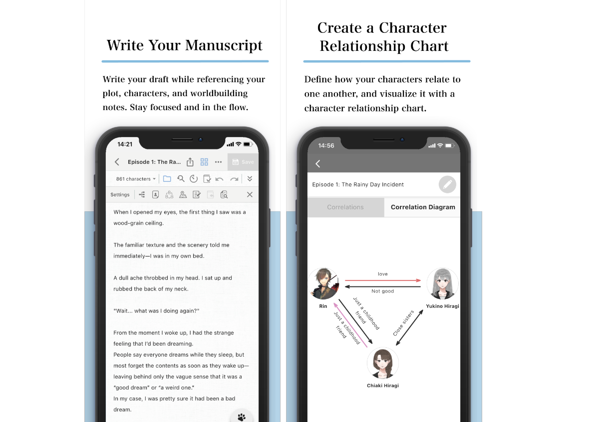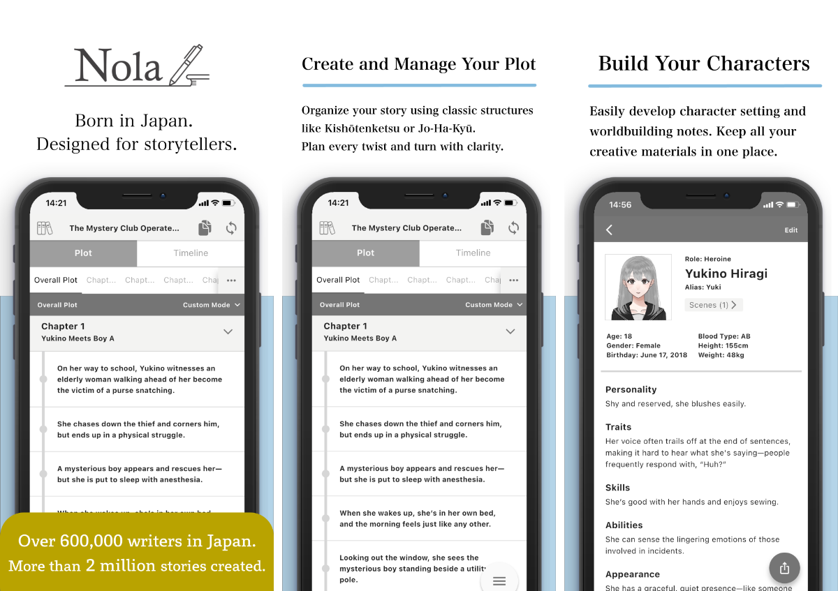 Nola is a simple, easy-to-use writing app loved by over 600,000 writers in Japan, including professionals. From outlining themes to building plots, writing drafts, organizing characters, and managing worldbuilding notes, Nola keeps your creative process intuitive and well-organized.