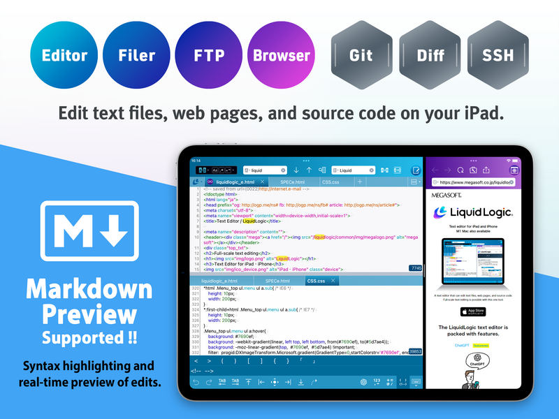 LiquidLogic was released in May 2019 as a high-performance text editor for iPad/iPhone that includes a file manager and FTP functionality, allowing users to edit files on the cloud and servers, and also offers web previews via a dedicated browser. It is distributed in 36 countries and regions worldwide, has reached approximately 188,000 downloads, and has received a high user rating of 4.6 out of 5 stars (1,241 reviews). Since then, LiquidLogic has steadily expanded its features and user base with additions such as an SSH terminal, Git version control, file comparison, ChatGPT functionality, and English language support.